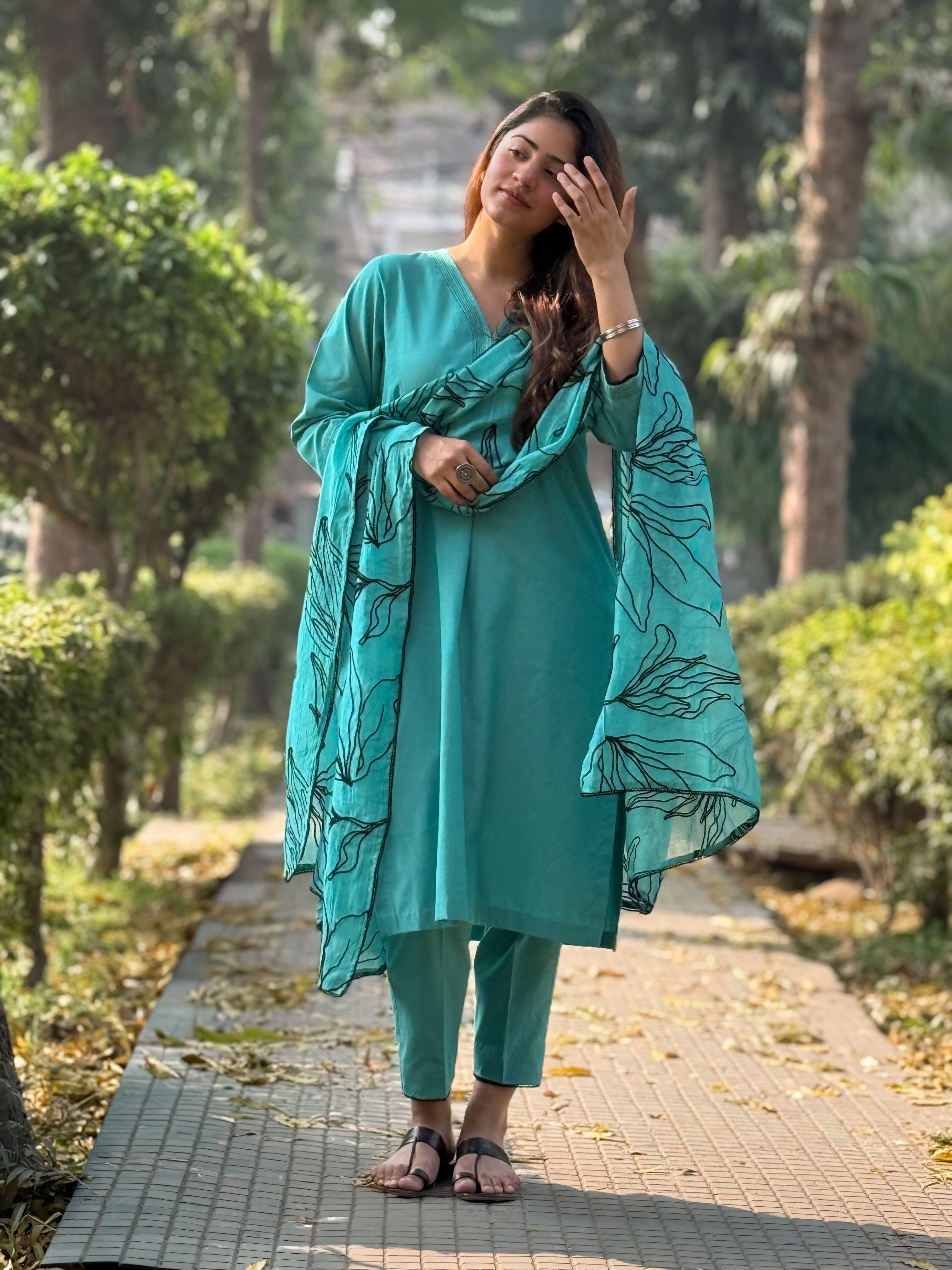 Aqua Teal Cotton Set with Off-White Embroidery
