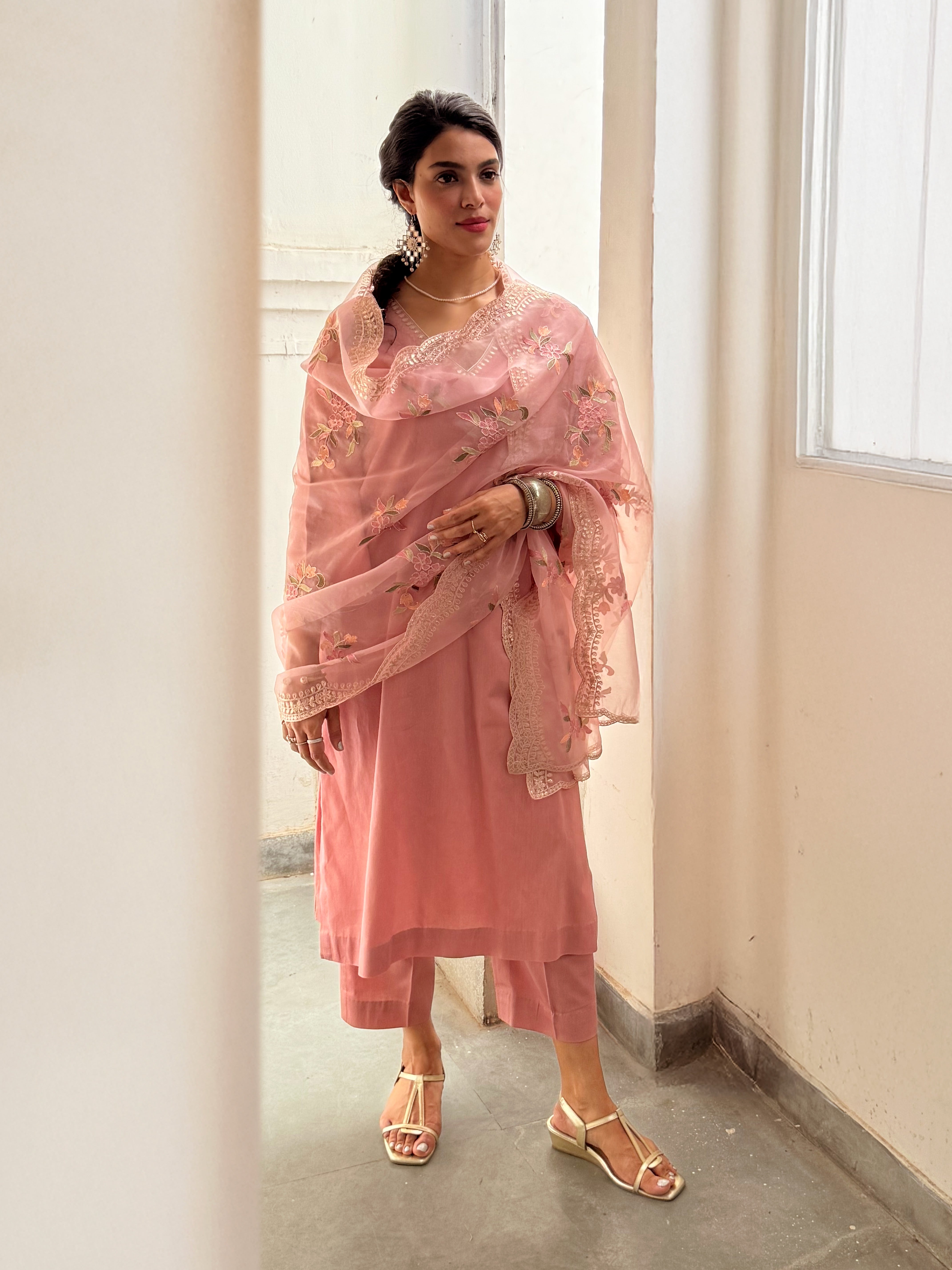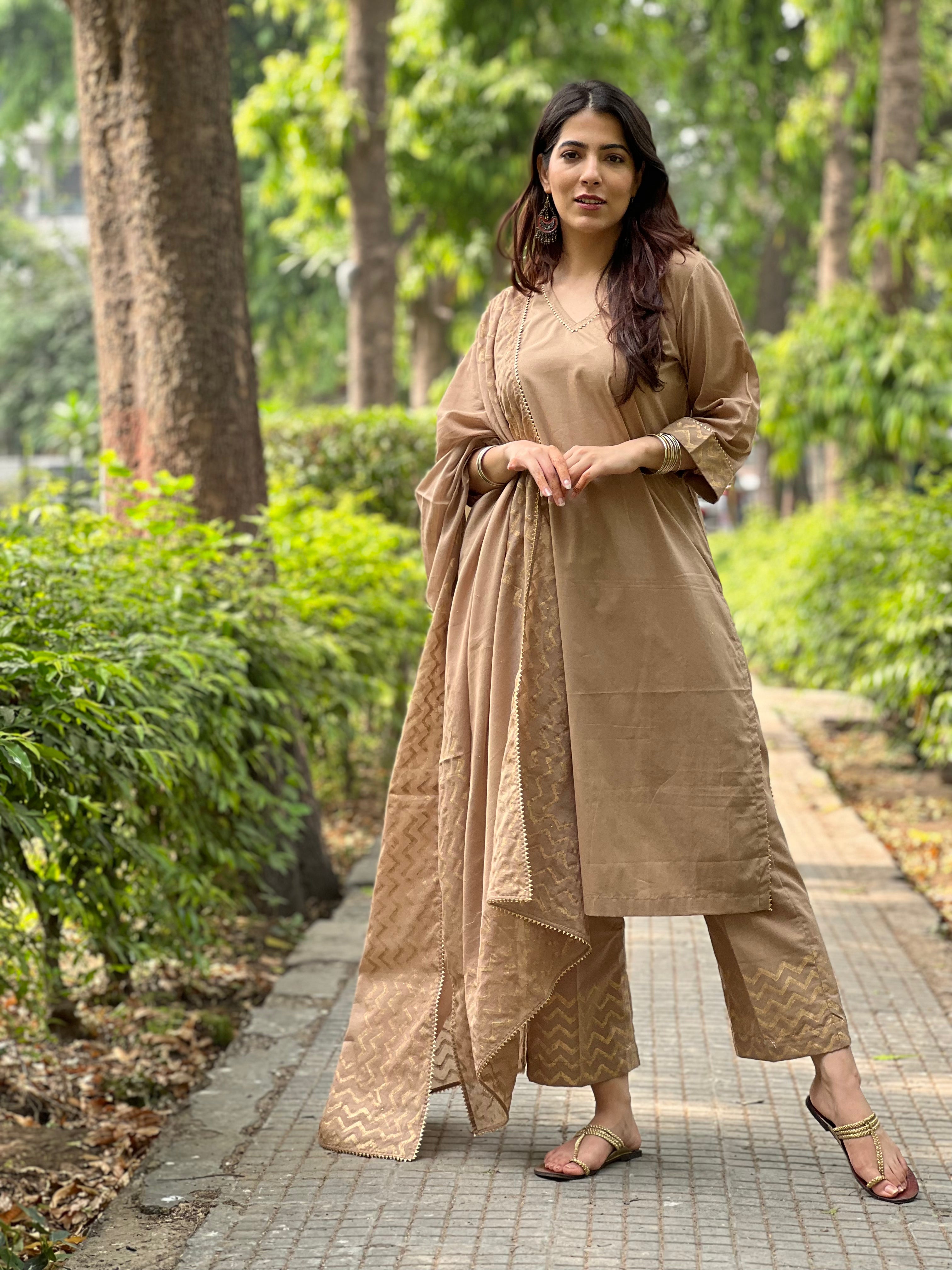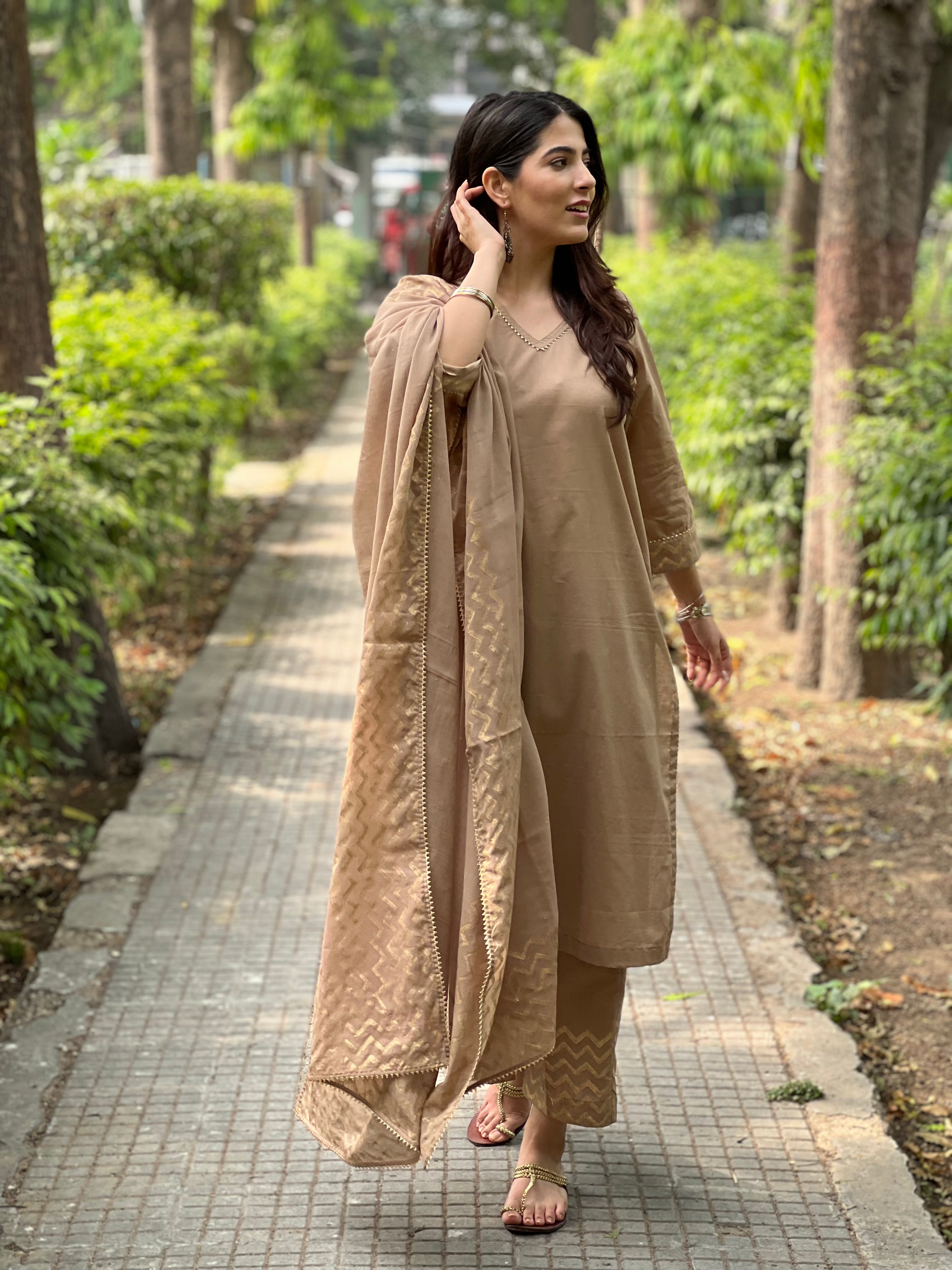 Beige machine embroidered chanderi set with a chanderi gota pati dupatta