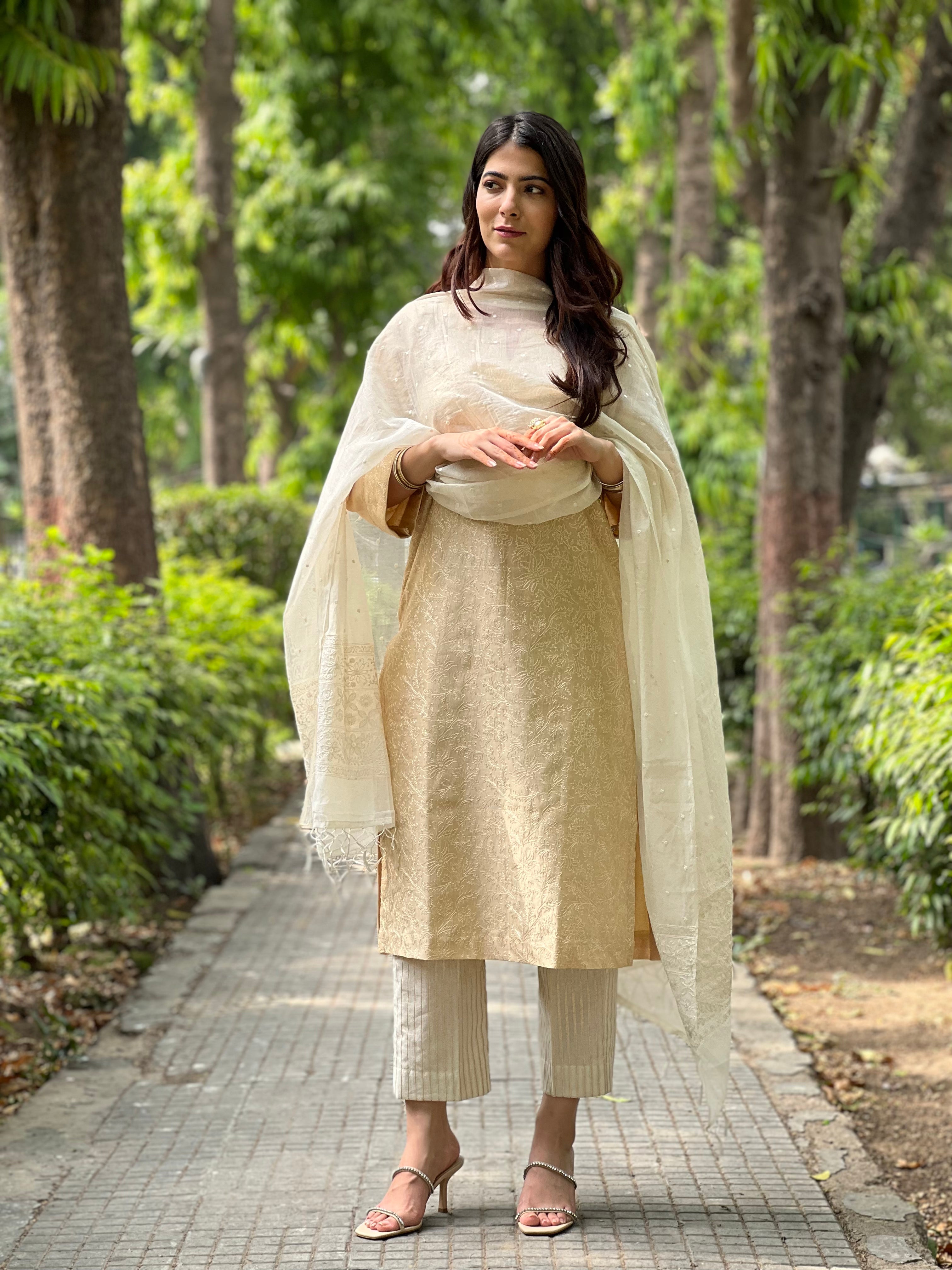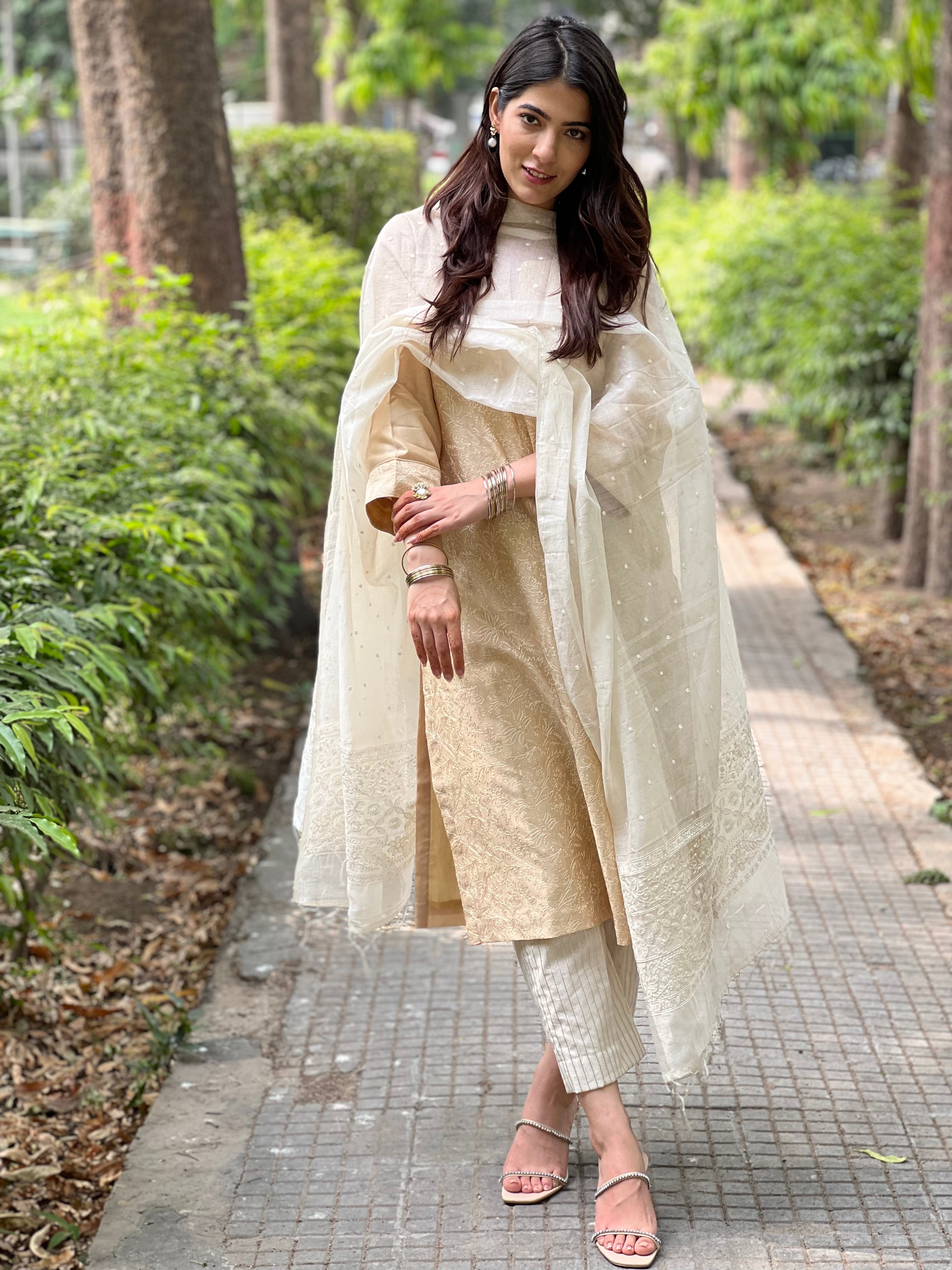 Beige Embroidered Chanderi Kurta with Off White Striped Pants and Dupatta