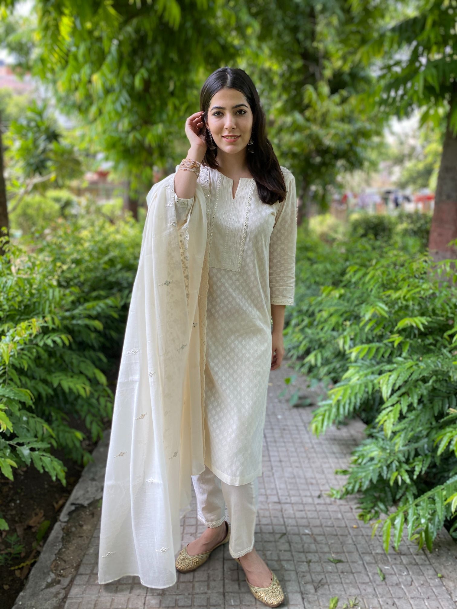 Off white cotton set with mirror work mul dupatta