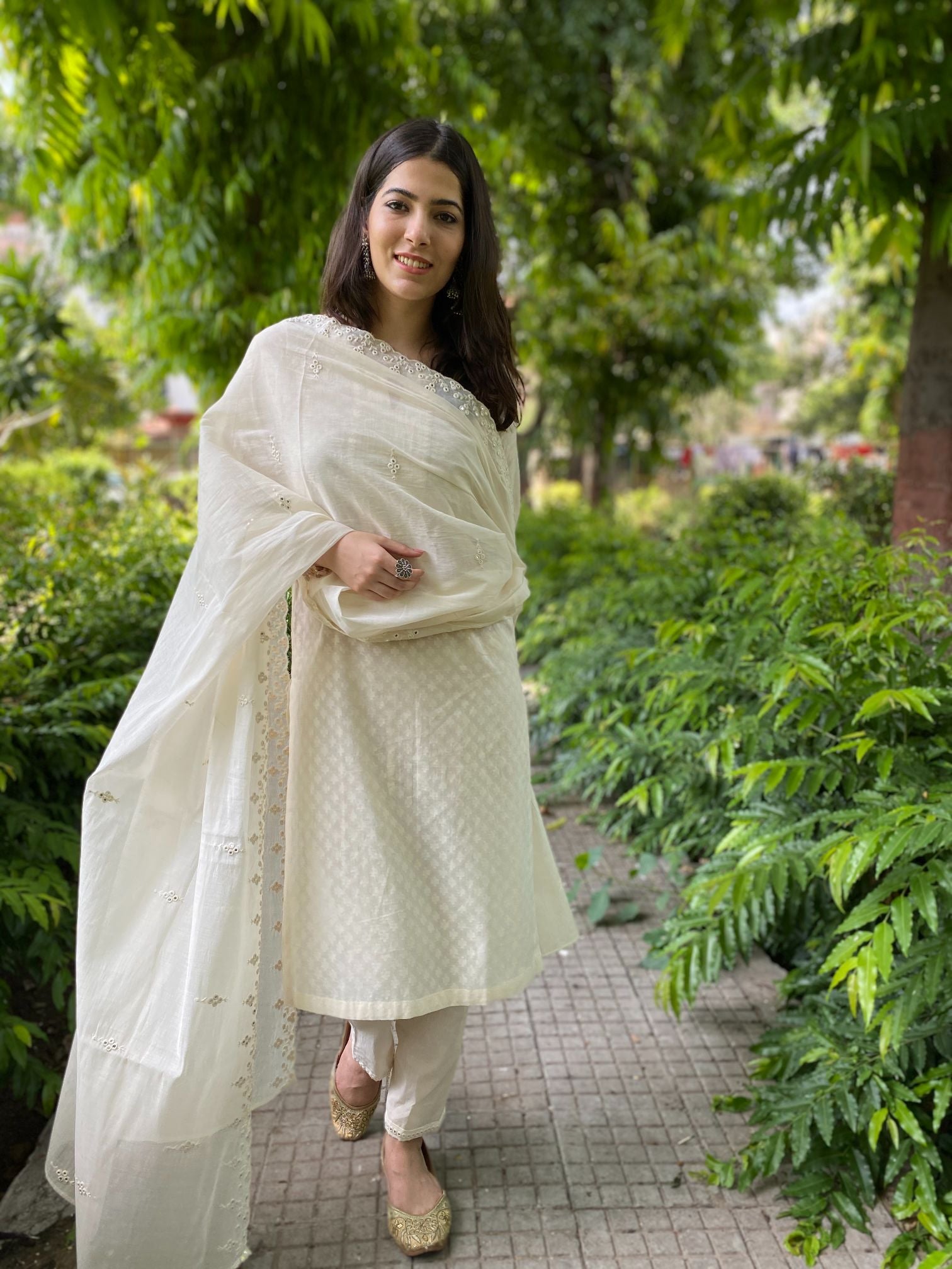 White linen set with blockprint dupatta