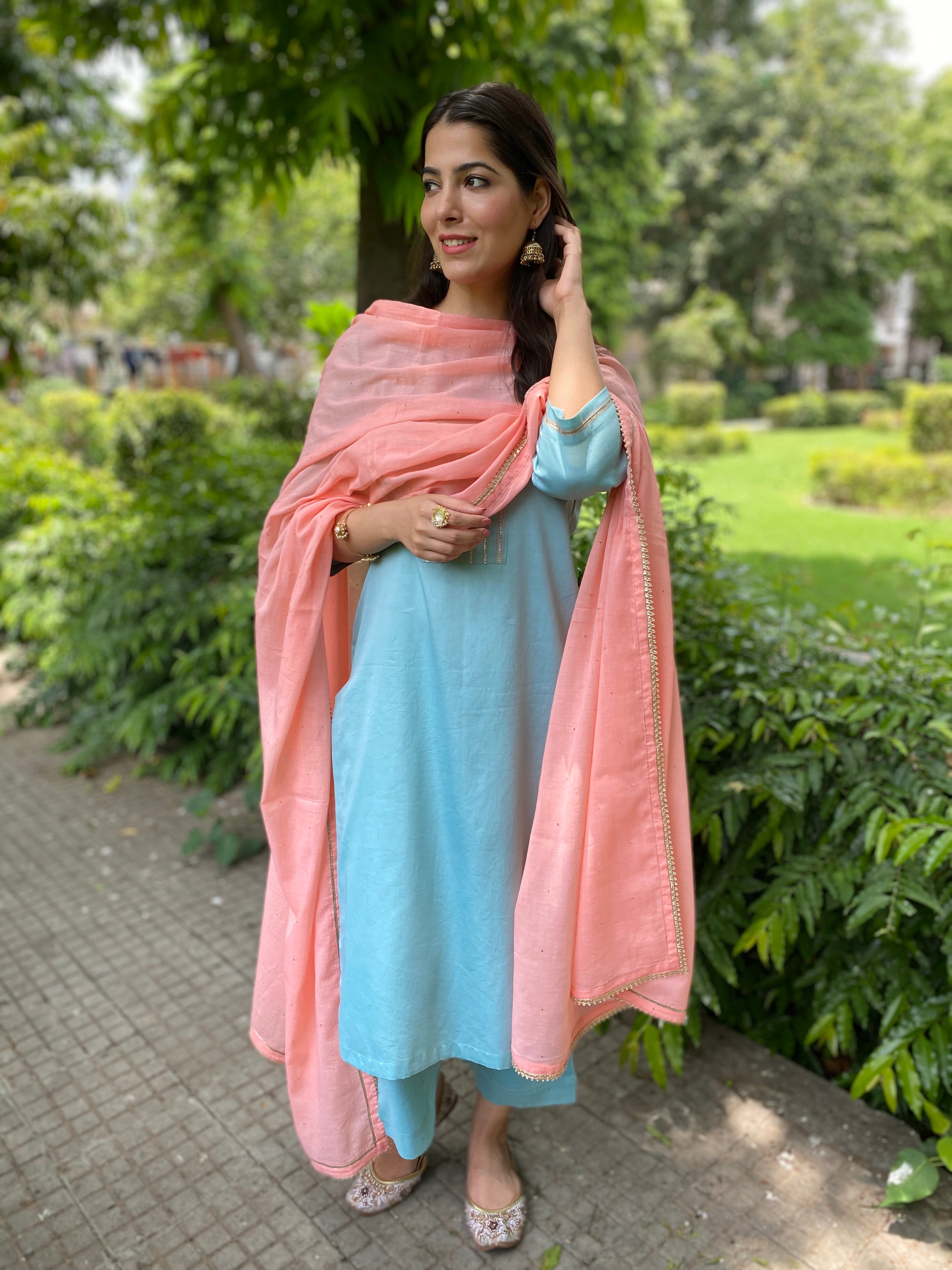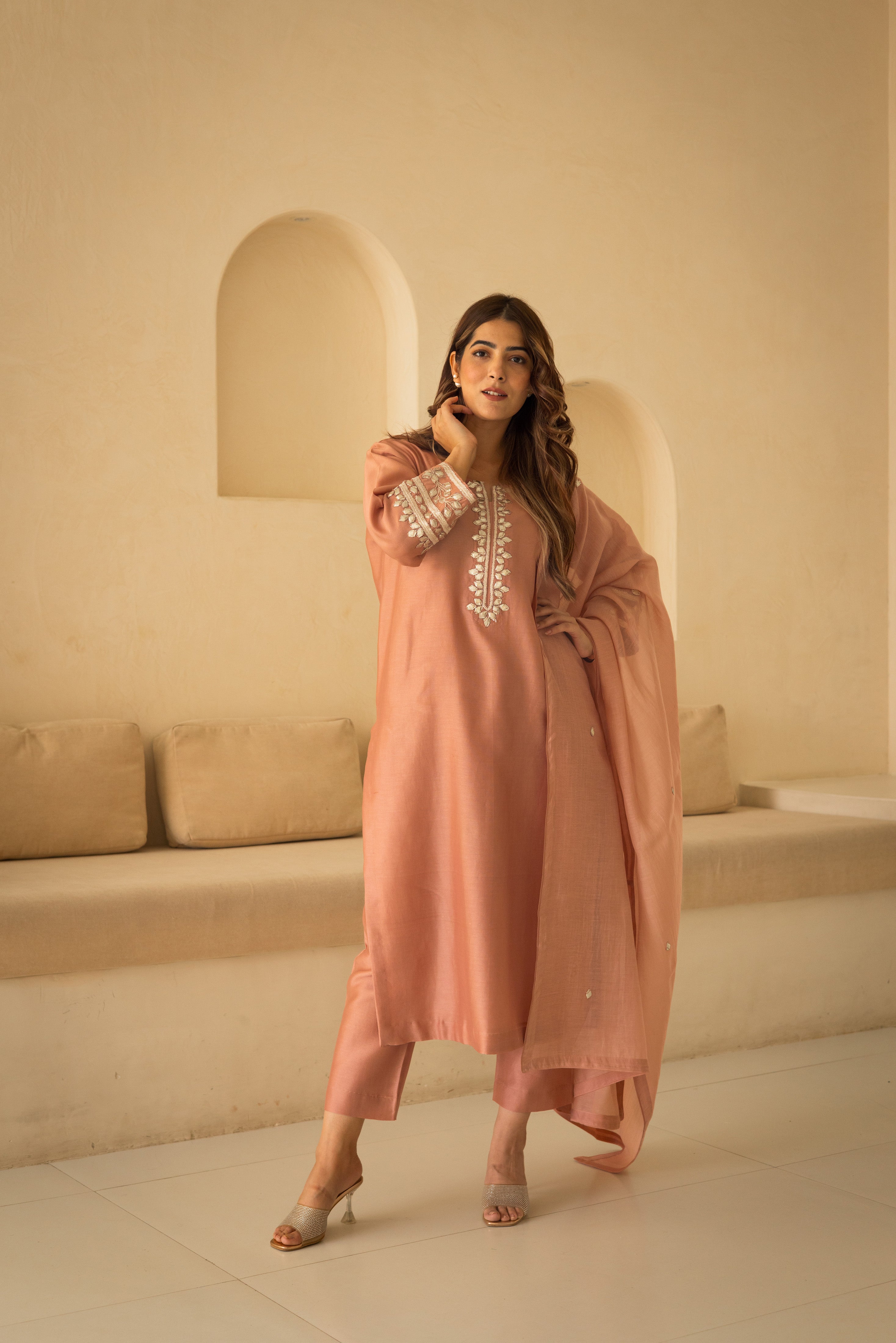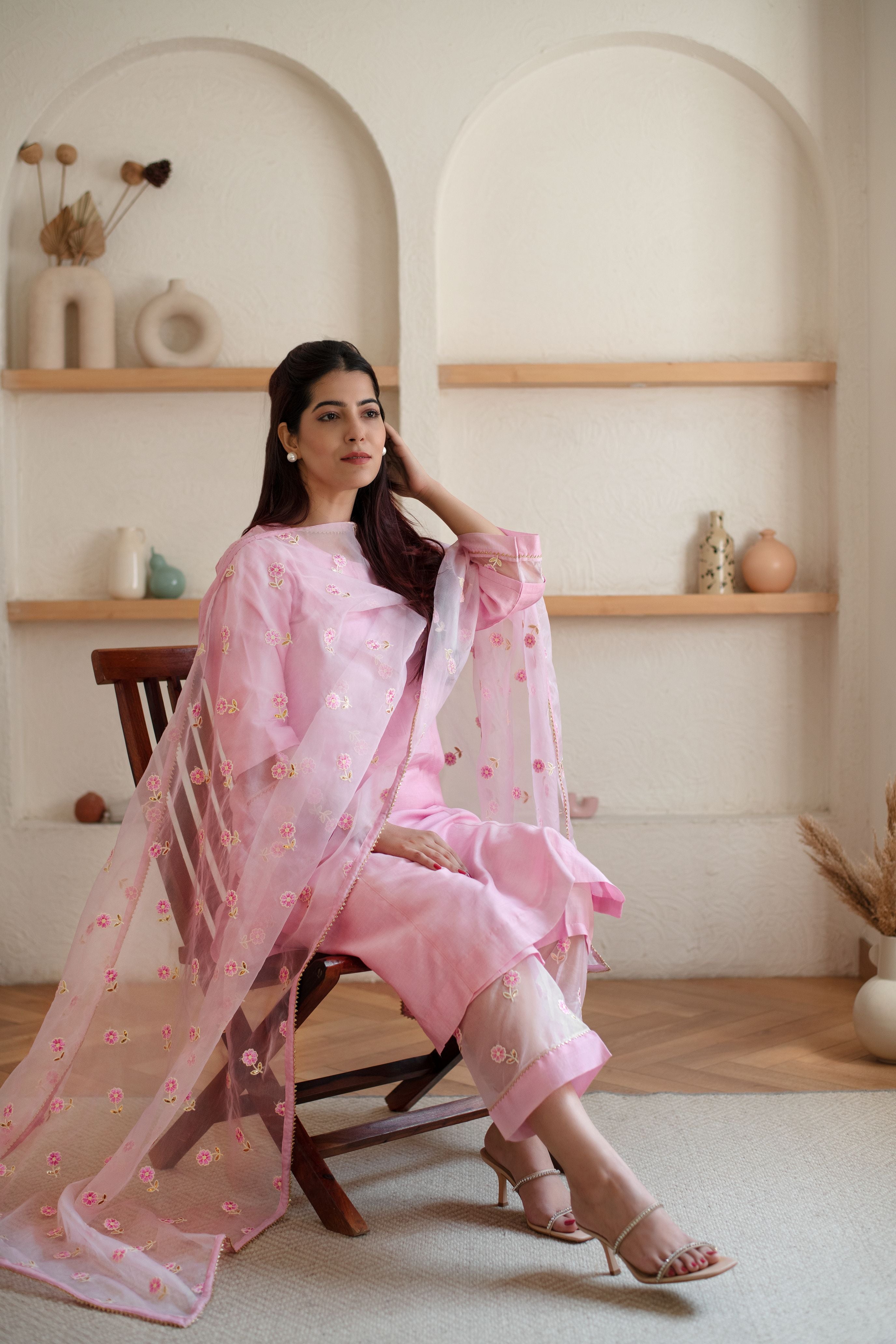 Off white and pink cotton set with dual shade mukeish work chanderi dupatta