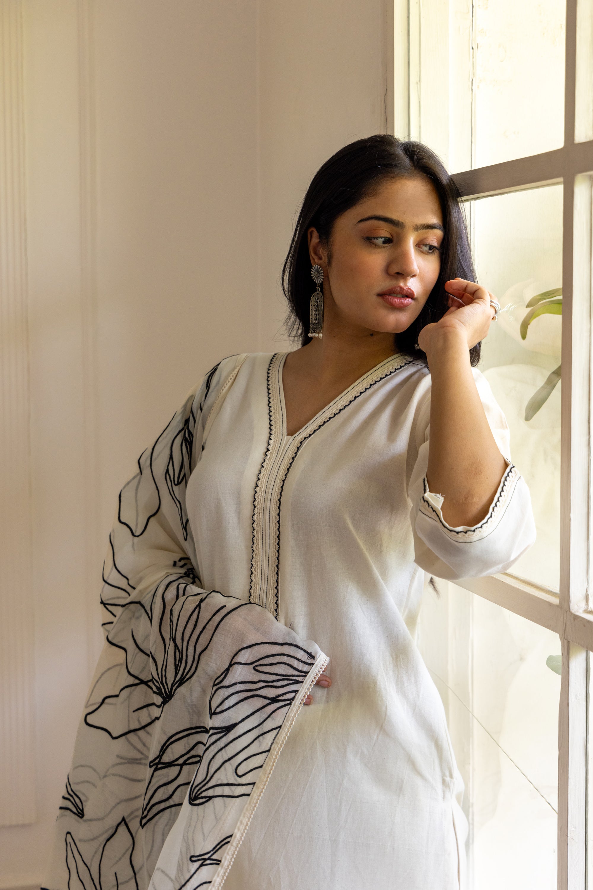 Offwhite cotton black chanderi embroidered dupatta set