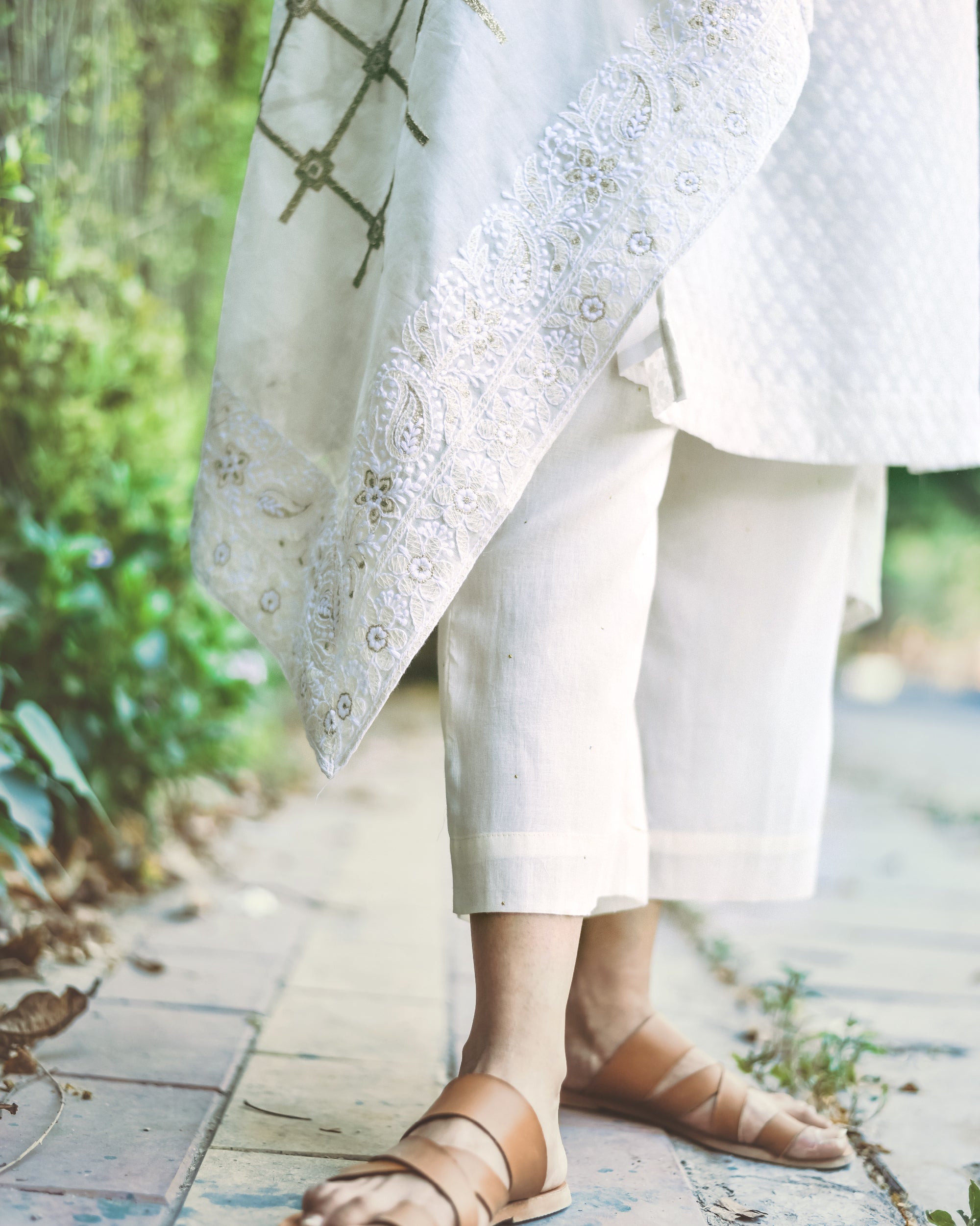 Our royal blue muslin kurta is paired with cutwork cotton pants and a cutwork cotton dupatta